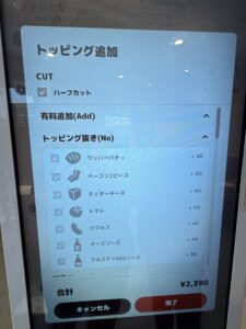 ハーフカットの注文は、セルフオーダーのトッピング追加画面の中で指定できます。