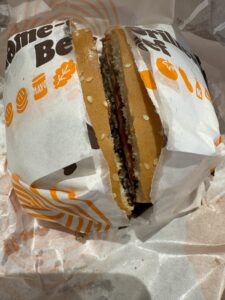 外側はしっかりラッピングされているので、途中でパティが1枚飛び出してしまったり、最後にバンズが残ったりすることもありません。