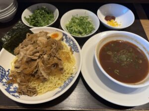 🍜肉盛りつけ麺、肉2倍、麺特盛、TP追加ネギチェーン店らしからぬパワフルメニュー。