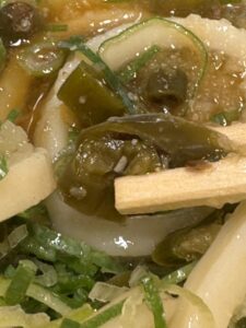青唐おろしぶっかけの青唐は、その一つ一つは辛いもの好きでも、辛い!というレベルです。辛いものが苦手な人は避けたほうがよいレベルの辛さですが、ある程度辛さが大丈夫であれば、ライムやお酢で味変しつつ、辛さと爽快感を楽しめる、これも、夏にぴったりのメニューと言えるでしょう。