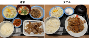 松屋の「スタミナ豚バラ炒め定食」は、通常サイズと、ダブルが選べます。
