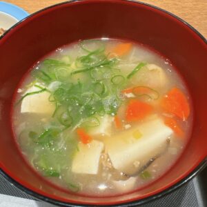 松屋の「スタミナ豚バラ炒め定食」には味噌汁が付いてきますが、味噌汁を参鶏湯風スープにアップグレードするのもおすすめです。